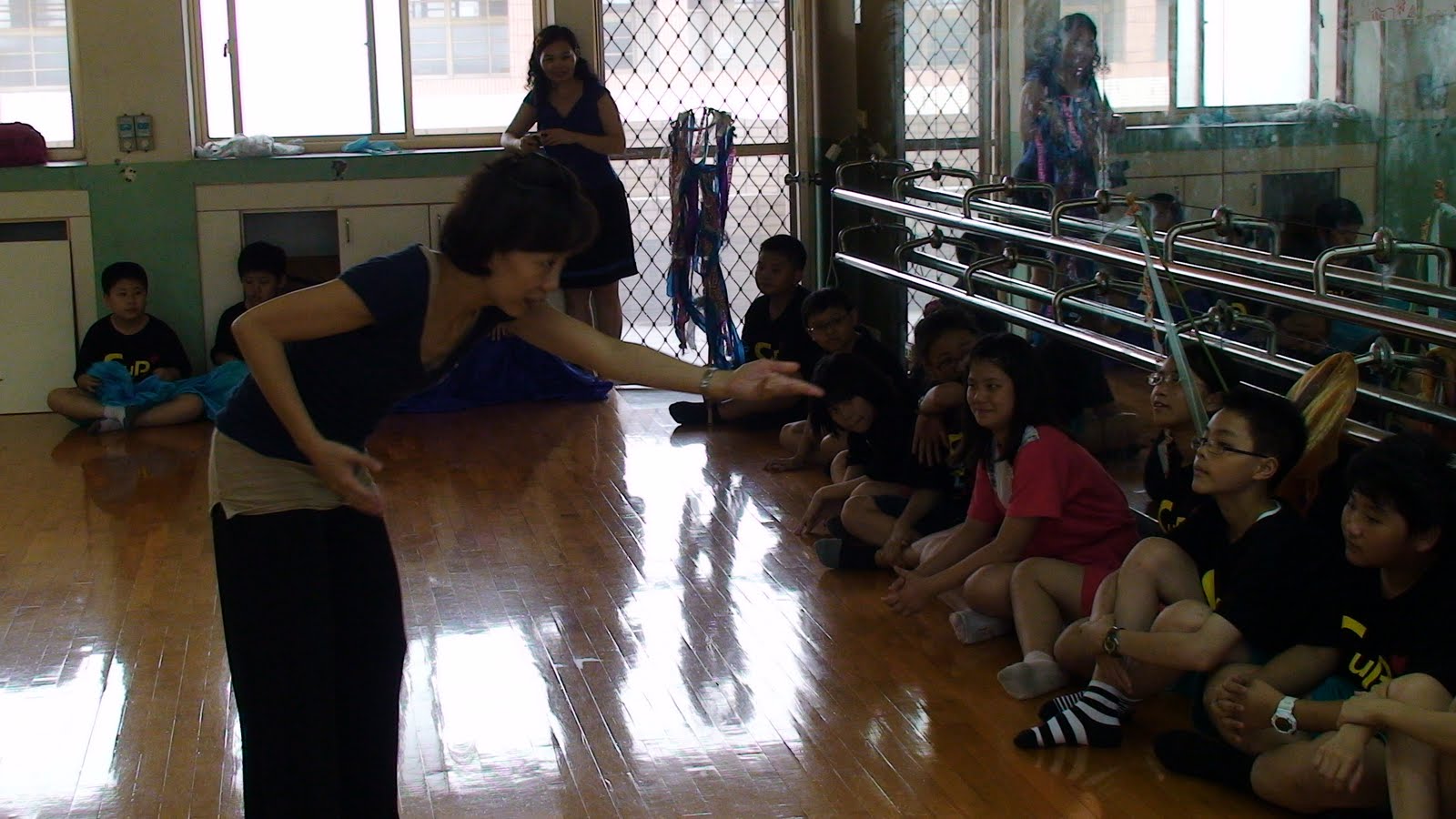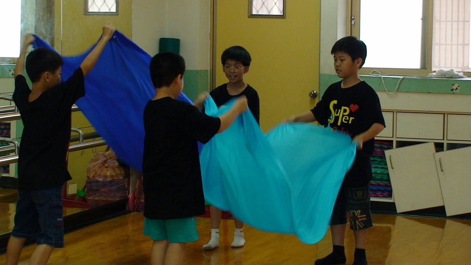 而海浪組演出後,美光老師則建議四位小朋友可以再多練習平移及上下穿越的動作,因為有加上長布條作道具,所以老師們特別示範了各種律動的方式,以避免道具纏在身上或打結~