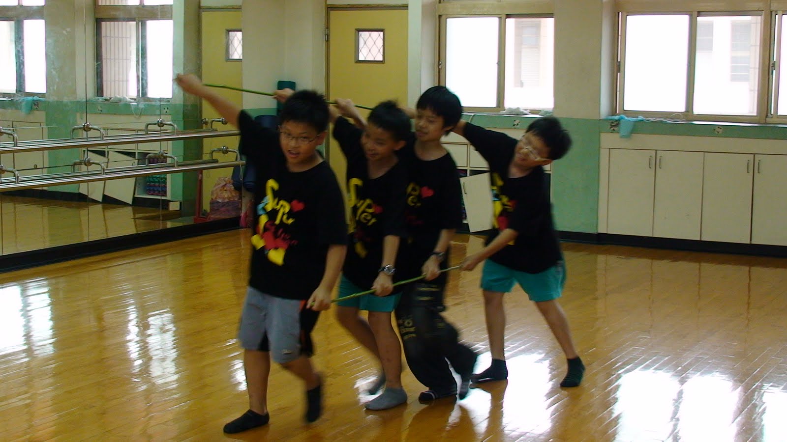再一次的練習之後,老師配上音樂讓孩子們熟悉舞台的呈現,並且再次輪流上場演出。經過練習,孩子們對於較大的肢體動作更加靈活而且熟練了!